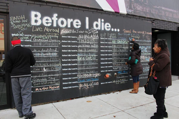 On your way to Why Louisville gift shop, take an opportunity to be part of an urban art project and pick up a piece of chalk. An oversized chalk board asks you, “Before I die I want to _____.” My husband and I want to live abroad.